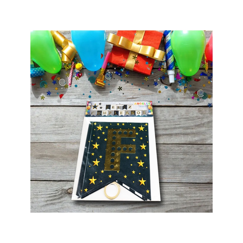 Guirnalda banner feliz cumplea帽os #7 modelo estrellas fondo negro y blanco con letras doradas le daras un ambiente especial a tu evento 贸 reuni贸n.